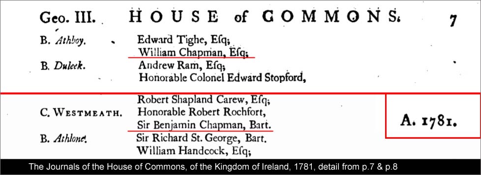 [ Additional Notes on William Chapman, an ancestor of Orde Wingate, or Looking for William Chapman ] Orde Wingate was a descendant of Maria Chapman, whose father William was the third son of Benjamin Chapman (c.1700-1779), and youngest brother of Sir Benjamin Chapman (1750-1810), 1st Bt. and Sir Thomas Chapman (1756-1837), 2nd Bt. Please do not confuse him with William Chapman (1812-1889), the grandfather of T. E. Lawrence. This William was a brother of T. E.'s great-grandfather. Though neither Burke's nor Debrett's has recorded his name under the Chapmans of Killua Castle, I have come to the above conclusion, after gathering up the following information. Info 1: Mary Ethel Stanley was the eldest daughter of Captain Orde Browne (1838-1900), who was the second son of Colonel Benjamin Chapman Brown (1798-1853) of Stouts Hill, Gloucester. He was the only son of Captain Thomas Browne (d.1803) of Hinckley, Leicester, and Maria Chapman. [Burkefs Family Records, 1994, pp,113-14, Ancestry.com] Info 2: Maria, wife of Captain Thomas Browne of Hinckley, was daughter of William Chapman, and cousin of Sir Benjamin Chapman, Bart, of Killua Castle, co. Westmeath. [Joseph Jackson Howard ed. Visitation of England and Wales, Vol.7, 1899, p.157] * This Sir Benjamin may be her first cousin, Sir Benjamin James Chapman (1810-1888), 4th Baronet. Info 3: Miss Chapman, daughter of William Chapman, and niece of Sir Thomas Chapman, Baronet, of Killua Castle, co. Westmeath married Henry Robert Battley, of Ashgrove on 10 May, 1810. [Burke's Genealogical and Heraldic History of the Landed Gentry of Great Britain & Ireland, Vol. 1, 1875, p.73] * Thanks to the British Newspaper Archive, I found a few articles which mentioned William Chapman, Esq., together with Sir Benjamin or Sir Thomas on newspapers published at Dublin in the 1780's. There is no doubt William Chapman existed. Furthermore, I found William of Irish member of parliament, for Borough of Athboy. Athboy is where Killua Castle, the country home of the Chapmans placed. His brother Sir Benjamin was M. P. for County Westmeath. [ link to 1779 list ] ![]() The above cutting image is from the 1781 list (On the web, only 1779 & 1781 lists included his name were found). His name was on a list of new members of the Irish House of Commons at a Saunders's News-Letter dated 24 June 1776. He held his seat until 1883 [Wikipedia: Athboy]. Miss Chapman of Info 3 was not Maria, but her sister Mary Anne or Marianne, who secondly married Edward Wells Bell at Dublin in 1820. (her grave at Kempsey, Worcestershire). Their marriage announcement were found on some newspapers on which Marianne had been described as niece of Sir Thos. Chapman, Bart. Info 4: Benjamin Chapman [c.1700-1779] had three sons and two daughters, by his wife Ann Tighe, daughter of Robert Tighe. [Burke's Genealogical and Heraldic Dictionary of the Peerage and Baronetage, 1878 ed., p.225] * Yes, three sons, Benjamin, Thomas, William. Two daughters, Elizabeth (d.1767), who became the second wife of Riley Towers, Esq. barrister-at-law of Dublin, and Henrietta Chapman, baptized on 23 Dec 1764. On the other hand, The Peerage, Baronetage, and Knightage of the British Empire, 1882 ed. said that Benjamin had two sons and a daughter by Ann Tighe [p.113]. This means, I imagine that, Henrietta died very young, and William died in a compromising situation? ... William vanished into the fog. Info 5: After Captain Thomas Browne died in 1803, Maria Browne (née Chapman) remarried Charles Ward Orde. Their marriage certificate dated 8 Dec 1808 shows the names of the two of witnesses: Benjamin Chapman and Isabella Chapman. [London Metropolitan Archives, Richmond upon Thames, Register of marriages, Feb 1784-Dec 1812, DRO/174/A/03/002, Ancestry.com] * I suggest that uncle Benjamin put his signature on the certificate because Maria's father, William had already passed away. Then, who was Isabella Chapman? It is likely that she was Maria's mother or mother-in-law, widow of William. Incidentally, I've found a death announcement of wife of William Chapman, Esq, on a newspaper dated 17 Feb. 1787. Her name was Mrs. Martha Chapman, another mother-candidate. By the by, this second marriage of Maria to the Orde family gave Orde Wingate his first name. Info 6: Sir Benjamin Chapman, is succeeded in his estates by his only surviving brother, Sir Thomas Chapman, Bart. [Saunders's News-Letter, 23 July 1810] * His only surviving brother suggests that Sir Benjamin had another brother who had died before 1810. The same Saunders's News-Letter, one of Dublin's established newspapers, dated 06 April 1789 told that William Chapman, Esq. died at Scarreen [sic]. This William might have been our William. (You can read this notice at The Gentleman's and London Magazine, 1789) Info 7: A member of Orde of Nunnykirk, Major Charles Ward Orde married Maria, relict of Thomas Browne and his wife, daughter of John Chapman [sic], Esq. of co. Westmeath, of the family of Chapman, of Killua Castle, Bart. [Burke's Genealogical and Heraldic History of the Landed Gentry, Volume 2, 1847, p.967] * John Chapman must have meant William Chapman. Burke's still had this mistake when I searched the web edition of Burke's Landed Gentry in 2010. Info 8: Ex-military man and author, Desmond Chapman-Huston or Wellesley William Desmond Mountjoy Huston (1884-1952) was the only son of Richard Newland Huston, of Annaghmaconway, and Drumbo Lodge, and Katharine Anna Mountjoy, daughter of William Chapman of Ashgrove, Co. Monaghan. [Who was Who, Vol.5, 1951-1960, p.200] * Another William Chapman was here. Desmond's parents got married on 28 Feb 1877 at Dublin. The Green Room Book; or, Who's Who on the Stage, 1907 ed. informs that his mother Katie Anna was grand-niece of Sir Benjamin Chapman (1810-1888), 4th Baronet, T. E.'s great-uncle. However, I've found nothing confirmed this claim yet. [January 2017, YAGITANI Ryoko] |